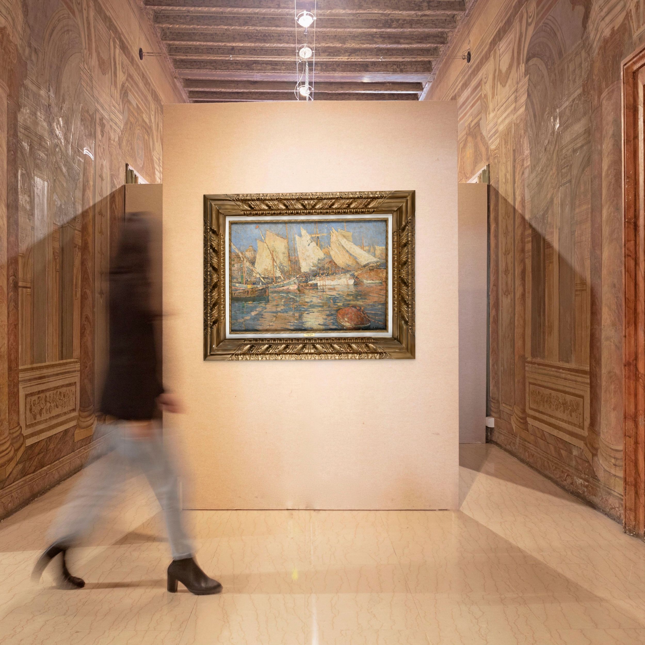 olio su tela, cm 68 x 98 - in cornice cm 101 x 130 1914 Firmato due volte; in basso a sinistra: 'G. Villani / ...'; in basso a destra: 'G. Villani -'. Sul retro, sulla tela: firma di mano dell’artista; cartellino a stampa dell’ ‘Unione Fascista Professionisti ed Artisti’ di Bergamo con scritto autore, indirizzo, titolo dell’opera, prezzo di vendita e anno di esecuzione (‘opera del 1914’). Sul telaio: antico cartellino consunto in lingua tedesca; antico cartellino con numero di riferimento (2).