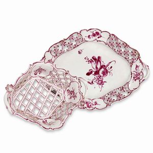 CESTINO, DOCCIA, MANIFATTURA GINORI, 1750 CIRCA in maiolica di forma ovale, pareti traforate e bordi intrecciati [..]