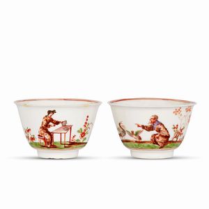 COPPIA DI TAZZINE, MANIFATTURA DI MEISSEN, 1740 in porcellana dipinta in policromia, forma di ispirazione orientale [..]