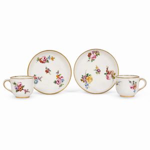 COPPIA DI TAZZINE CON PIATTINO, MANIFATTURA DI SÈVRES, 1770 CIRCA in porcellana tenera dipinta in policromia [..]
