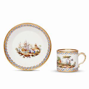 TAZZINA CON PIATTINO, MANIFATTURA DI MEISSEN, 1730-1735 in porcellana dipinta in policromia, tazza a coppa emisferica [..]
