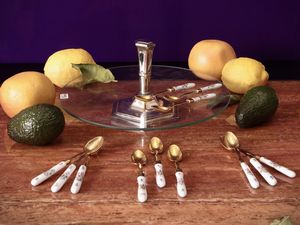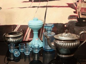 h da cm 3 a cm 20 (10) XX secolo tra cui un set da rosolio in vetro azzurro con bottiglia e sei bicchierini