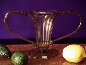 h cm 21x37x18 Murano, 1950 ca. in vetro soffiato fumè e grandi anse a forma di ali di farfalla.