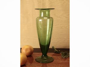 h cm 29 Murano, 1992 in vetro soffiato a fazzoletto su piede alto con decoro di fasce policrome. Firma a punta [..]