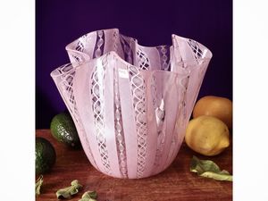 h cm 24,5 Murano, seconda metà del XX sec. in vetro soffiato rosa con canne a reticello e zanfirico. Firma sotto [..]