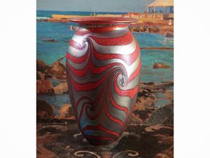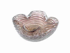 h cm 29 Murano, 1950 ca. con inclusione di filamenti all'interno e creste laterali trasparenti applicate a cal [..]