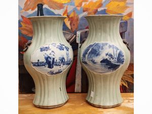 h cm 40 Cina, XIX secolo dipinti in monocromia blu con scene di genere entro riserve sagomate, prese zoomorfe, [..]