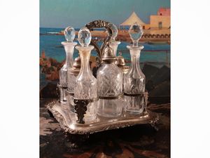 h da cm 18 a cm 25 (8) inizio del XX secolo un set da rosolio realizzato come un carro con sei bicchierini ed [..]