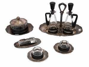 gr netti 630, oliera h cm 20x26x18 (5) Anni Trenta/Quaranta realizzato in vetro sfaccettato trasparente e nero [..]