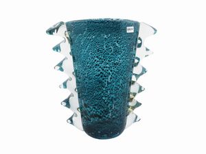H cm 31,5 Murano, 1940 ca. in vetro incolore sui toni dell'azzurro blu con creste lavorate trasparenti applicate [..]