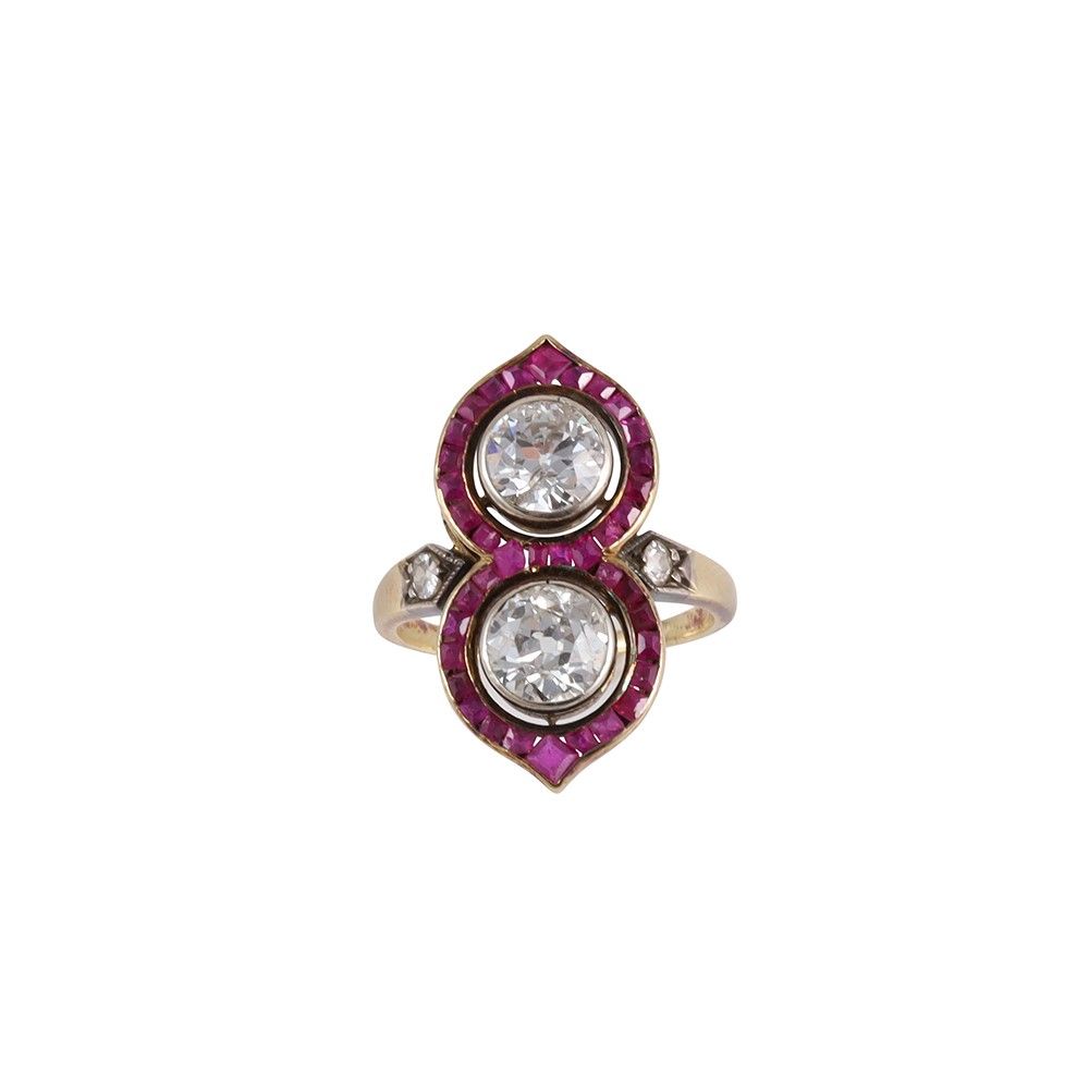 in oro e platino con due diamanti taglio antico europeo disposti in linea del peso complessivo di 1,60 ct ca., contornati da rubini carrè, gr. 5,4. Misura 12
