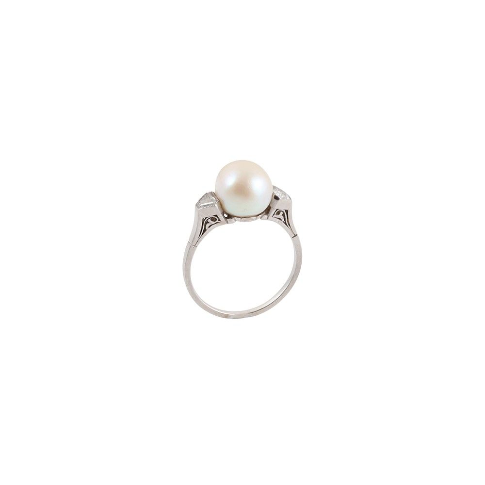 in platino con perla naturale d'acqua salata 7,3 / 8,8 x 10,1 mm ca., affiancata da diamanti, gr. 4,3. Misura 14 Analisi gemmologica n. 410042 del 14/05/2024 rilasciata dal laboratorio LFG di Parigi, attestante che la perla è naturale d'acqua salata