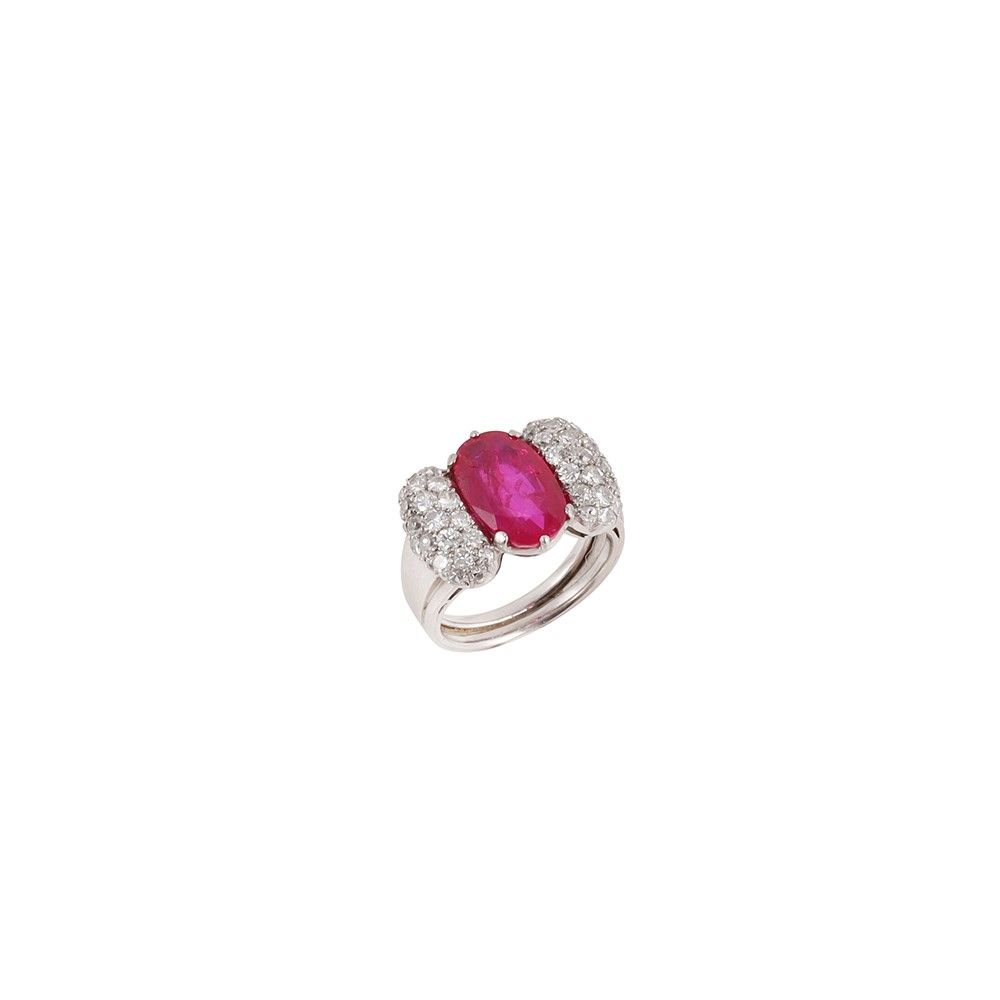 in platino a fascia con rubino ovale del peso di 4,31 ct posto al centro affiancato da motivi bombati in pavé di diamanti, gr. 10,7. Misura 14,5 Analisi gemmologica n. GRS2023-017727 del 18/01/2023, rilasciata dal laboratorio GRS di Meggen, attestante che il rubino č di provenienza Myanmar e non ha subito trattamento termico