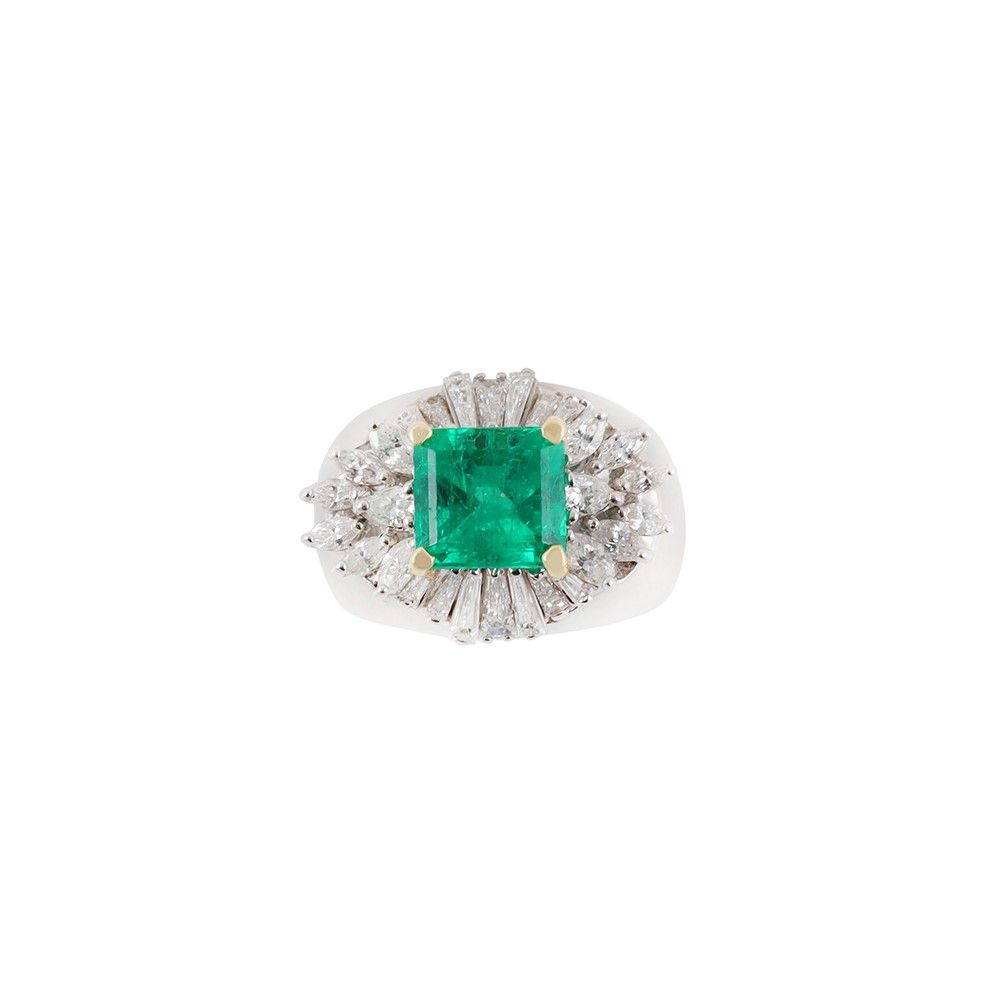 in oro bianco a fascia bombata impreziosita da uno smeraldo a forma ottagonale del peso di 3,40 ct ca., contornato da diamanti taglio baguette, navette e a goccia, gr. 15. Misura 14 Analisi gemmologica n. 3346 del 10/05/2016, rilasciato dal laboratorio CISGEM di Milano, attestante che lo smeraldo è di provenienza Colombia