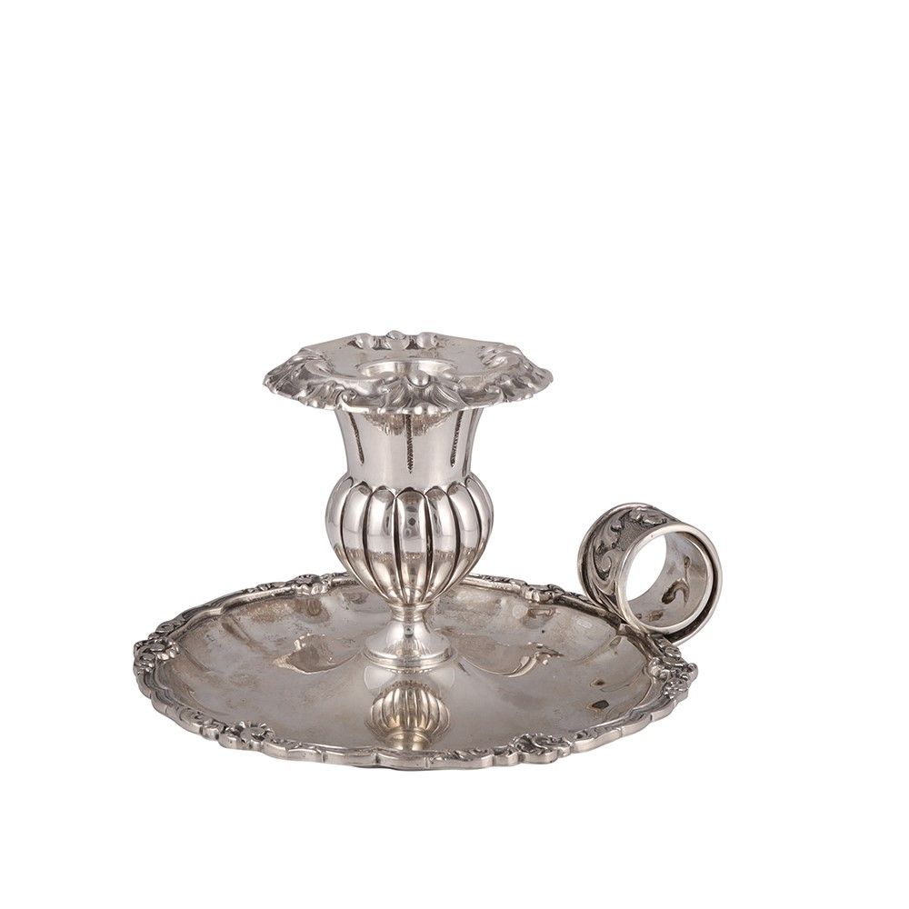 in argento, con fusto a balaustro baccellato, piattino e portacandela con bordura a rocaille, gr. 300 ca. Dimensioni 14 x (h) 9 cm ca. Numerario: 23 MI (Luigi Genazzi - Milano)
