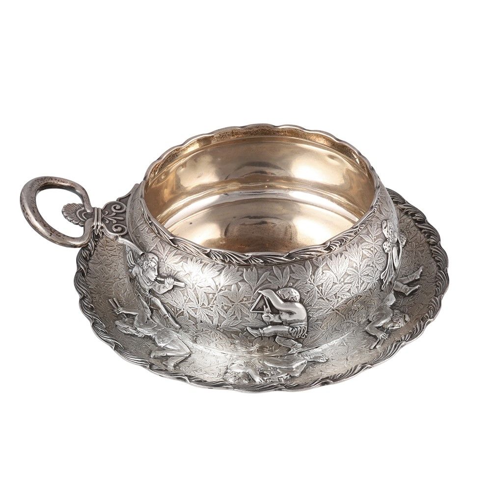 in argento sterling, decori con putti musicanti su motivi fogliacei bordure di linea mossa, ciotola con presa ad anello, gr. complessivi 650 ca. (lievi ammaccature) Dimensioni ciotola 17 x 13 (h) 6 cm ca.; diametro piattino 18 cm Recanti l'incisione: Washington, E. Connor Taylor 1884 Firmati: Tiffany & Co. Numerati rispettivamente: 2834M6876 Sterling-Silver 988 e 5472M4800 Sterling-Silver 991