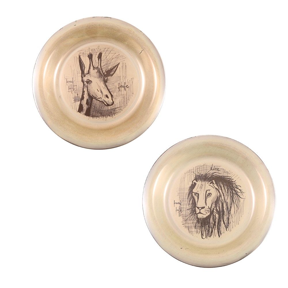 in argento 925, decorati con incisioni all'acquaforte raffiguranti rispettivamente una giraffa e un leone, gr. complessivi 400 ca. Corredati da certificato di garanzia e da cornice originale. Diametro 20 cm Titolati e firmati in lastra al fronte Al verso recano l'inscrizione 'Gravée à l'eau forte sur argent sterling 1er titre - 1975 Berard Buffet' e 'Gravée à l'eau forte sur argent sterling 1er titre - 1976 Bernard Buffet' Numerati: D 189 (da un'edizione totale non dichiarata)
