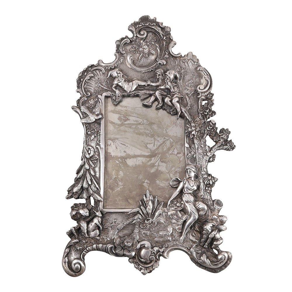in argento 925, riccamente decorata a sbalzo con personaggi e animali del bosco, gr. netti 640 ca. Dimensioni 33 x 20 cm ca. Marcata: Tiffany & Co. Sterling