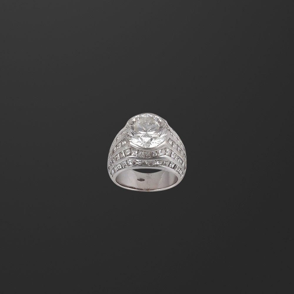 taglio a brillante del peso di 3,87 ct, montato al centro di un anello in oro bianco ornato da diamanti carré, gr. 10,3. Misura anello 7,5 Analisi gemmologica n. 58722 del 21/02/2025 rilasciata dal laboratorio IGI di Milano