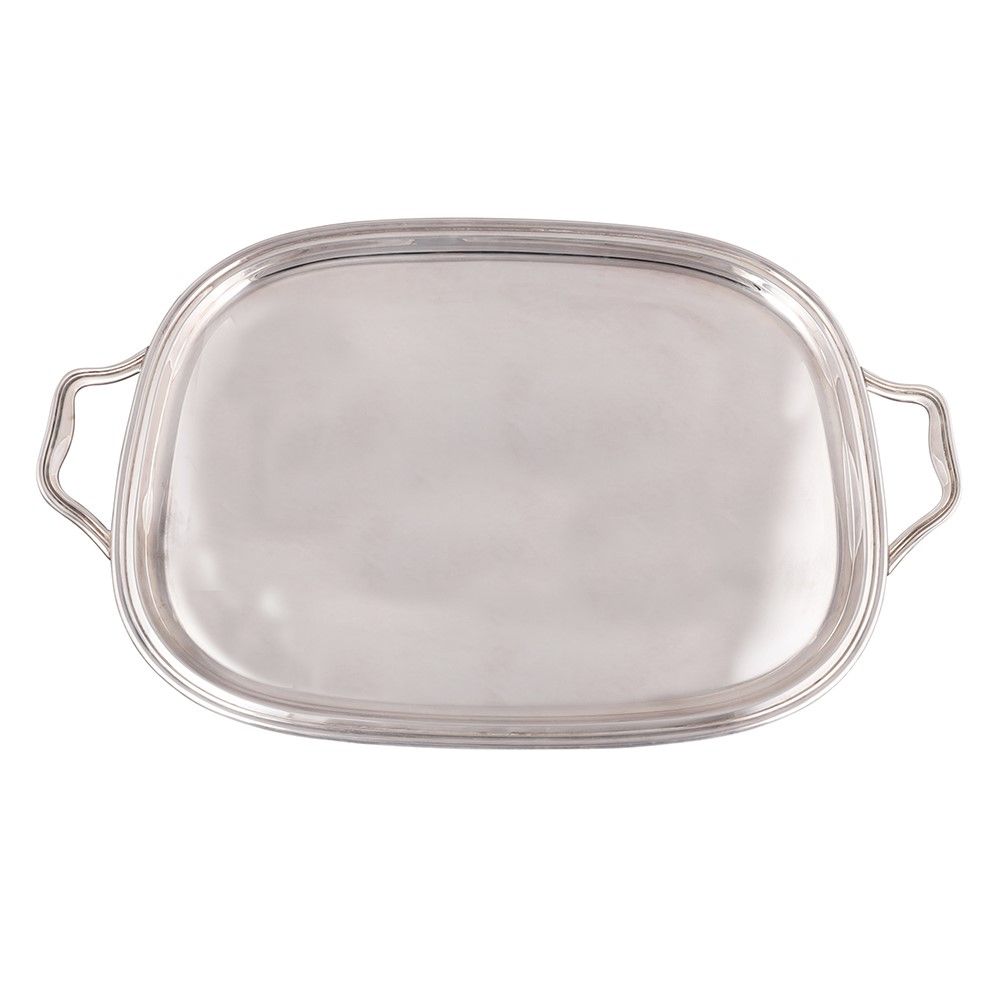 in argento, a corpo ovale con bordura gradinata e manici laterali, gr. 2.180 ca. Dimensioni 59 x 38,5 cm ca. Numerario: 30 PD (Zaramella Argenti - Padova)