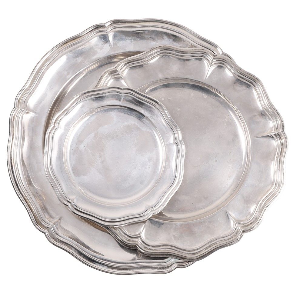 composto da sei piatti da dessert e due piatti da portata, in argento, a corpo circolare polilobato con bordura scanalata, gr. complessivi 2.800 ca. Diametro 37 - 31 e 20 cm ca. Manifattura italiana, punzoni con fascio