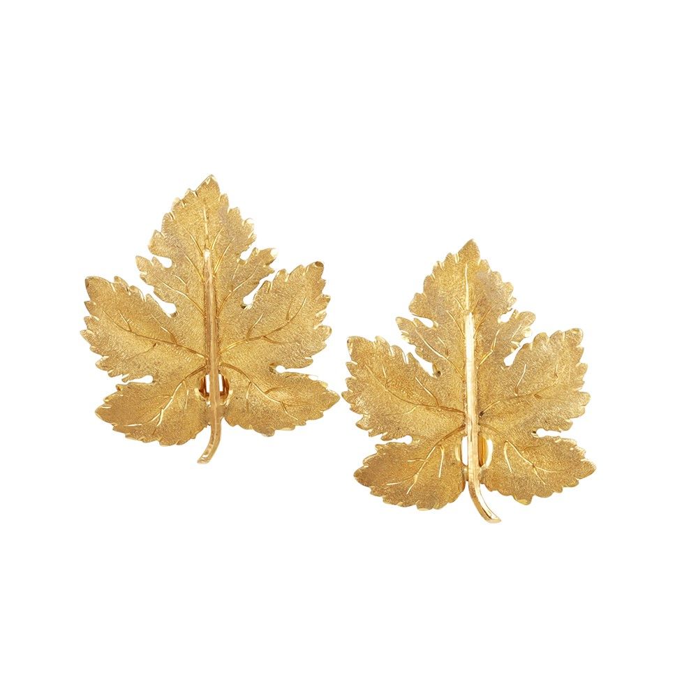 in oro giallo a foglia di vite, gr. 15,7. Dimensioni 3,4 x 3 cm ca. Firmati: M. Buccellati Italy