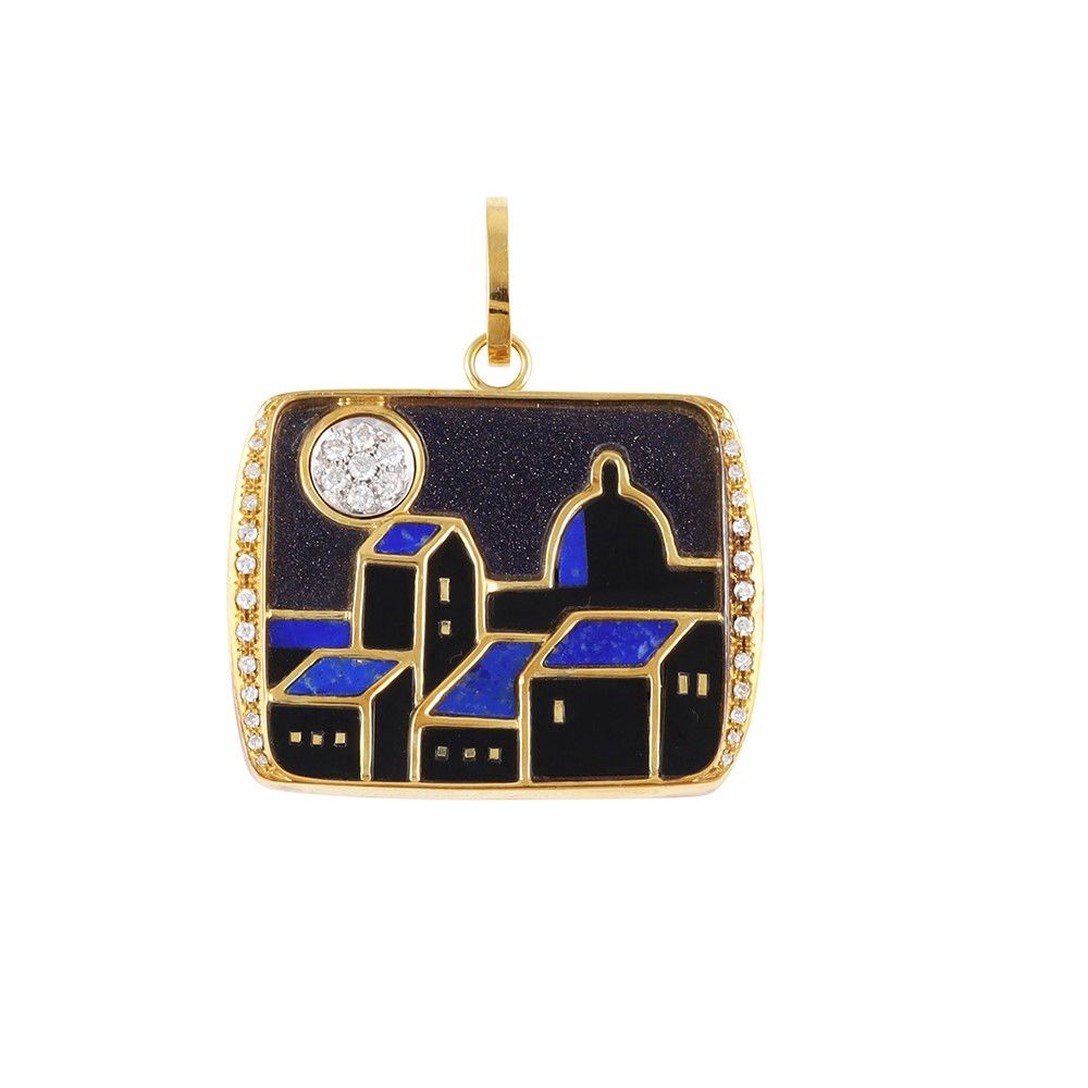 a forma rettangolare in oro giallo e oro bianco impreziosito da brillanti, raffigurante una veduta architettonica notturna formata da elementi in lastra di lapislazzuli, onice e smalto 'glitterato', gr. 41,2. Corredato da custodia. Dimensioni 4,4 x 4 cm ca.