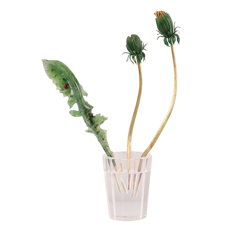 composta da due steli di tarassaco in oro giallo, con boccioli in smalto verde (mancanze) e giadeite, completa la composizione una foglia in nefrite finemente intagliata, con dettagli in oro, su cui è posta una coccinella in smalto. Il tutto è contenuto in un vaso in cristallo di rocca intagliato. Corredata da custodia originale e certificato di autenticità. Altezza massima 20 cm ca. Punzoni russi Gennady Pylin (Mosca, 1955) è un artista russo rinomato per le sue sculture in pietra intagliata, in particolare quelle ispirate alla natura, realizzate con un approccio realistico che esalta la bellezza delle pietre selezionate con cura. Ogni sua opera è unica, frutto di una meticolosa ricerca nella lavorazione delle pietre dure. Le sue sculture sono apprezzate per l'eccezionale precisione tecnica e l'abilità nell'intaglio. Le creazioni di Pylin sono esposte in numerose gallerie e musei, tra cui il Museo dell'Ermitage di San Pietroburgo.