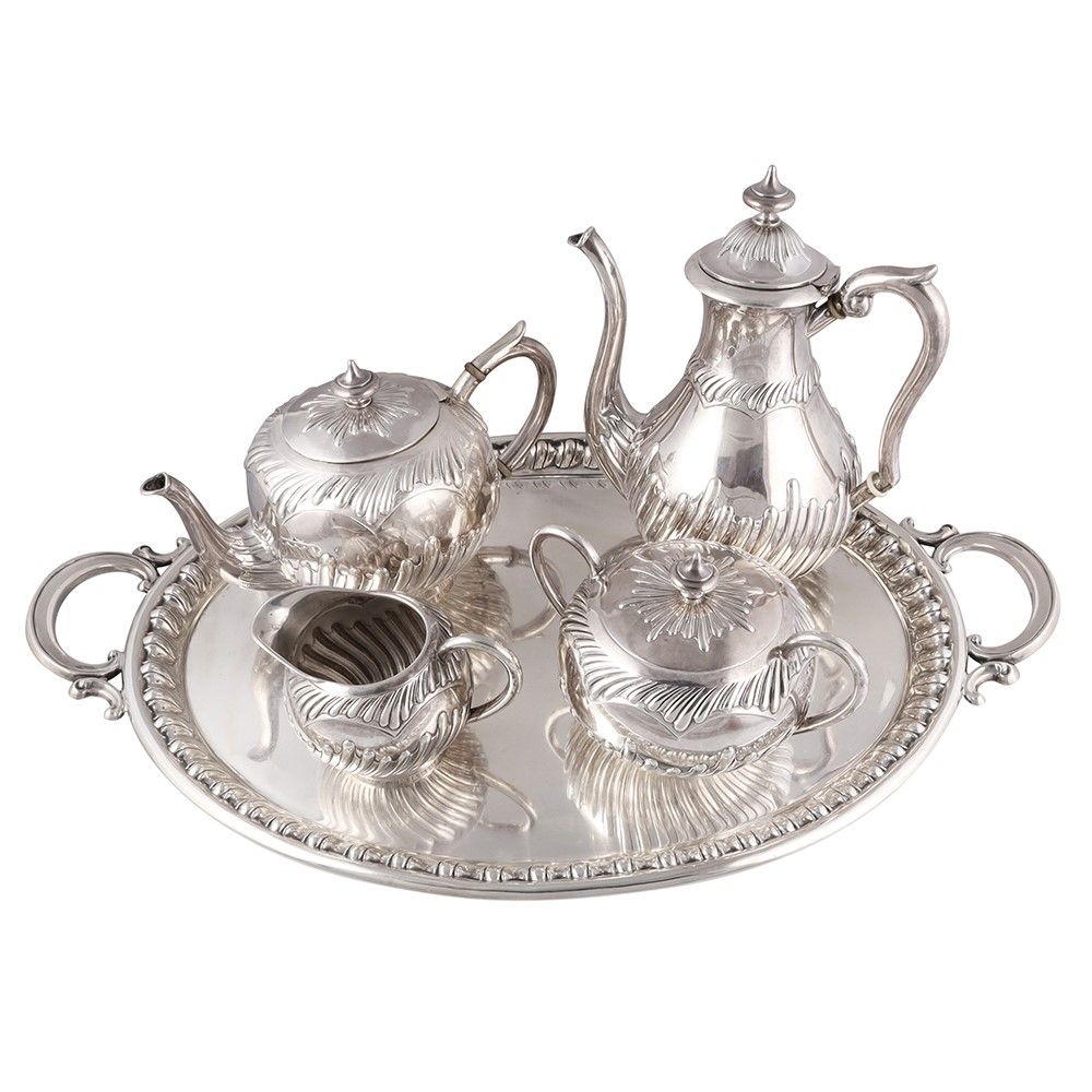 in argento 900/1000 composto da teiera, caffettiera, zuccheriera e lattiera a corpi espansi con nervature baccellate ondulate, medesimo motivo sui coperchi con prese a balaustro. Vassoio ovale con bordura baccellata e prese laterali, gr. complessivi 4.800 ca. Dimensioni vassoio 58 x 35 cm ca. Manifattura Tedesca