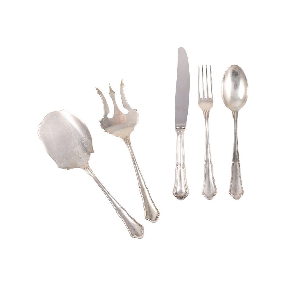 in argento, composto da 170 pezzi, gr. complessivi 6.700 ca. (escluse le posate con parti in metallo). Manifattura italiana