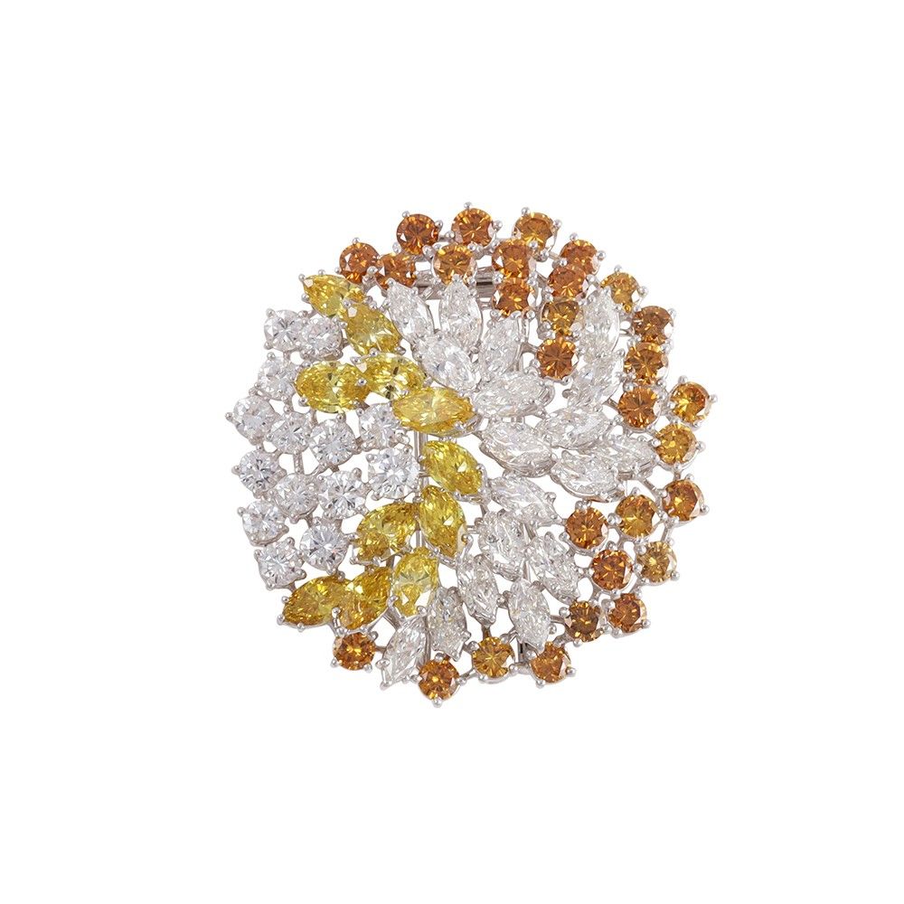 a rosone in platino interamente impreziosita da brillanti e diamanti taglio navette del peso complessivo di 12 ct ca., gr. 26,5. Diametro 4 cm ca.