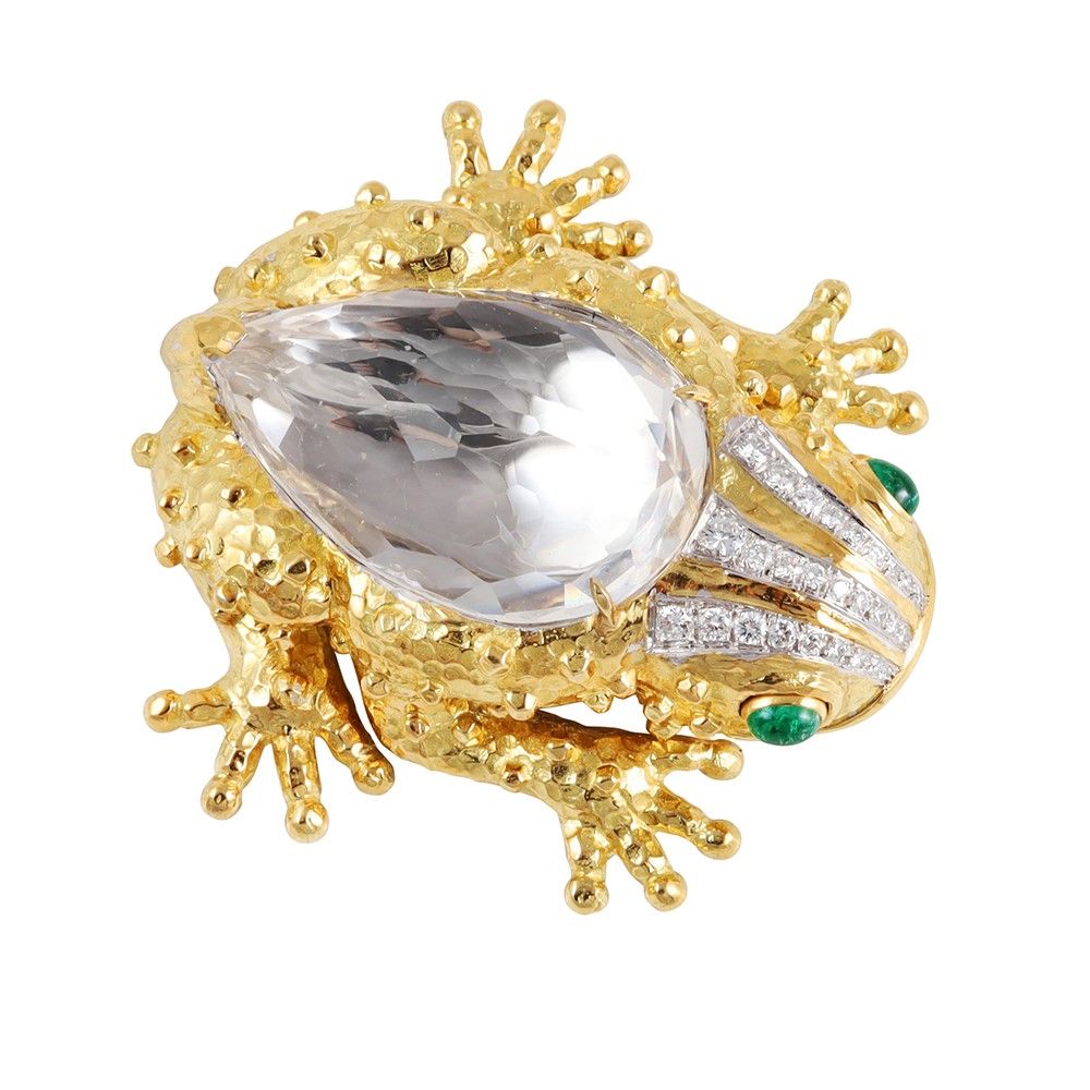 doppio uso, realizzata in oro giallo e platino, sormontata da un grande quarzo ialino sfaccettato. Due smeraldi taglio cabochon per occhi e brillanti ad ornamento, gr. 73,8. Corredata da custodia-pochette originale. Dimensioni 5,6 x 5,6 cm ca. Firmata: David Webb
