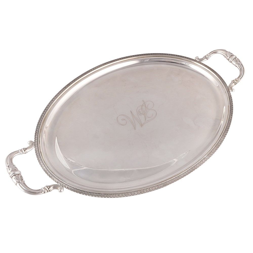 in argento, a corpo ovale centrato da monogramma. Bordura a palmette e manici laterali fogliati, gr.  800 ca. Dimensioni 45 x 27 cm ca. Numerario: 7 TV (Argenteria Schiavon s.r.l. - Villorba)