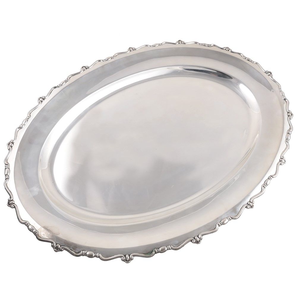 in argento, a corpo ovale con bordura mossa, gr. 1.290 ca. Dimensioni 51 x 37 cm ca. Numerario: 3 VC (Gastaudi & Gautero - Vercelli)