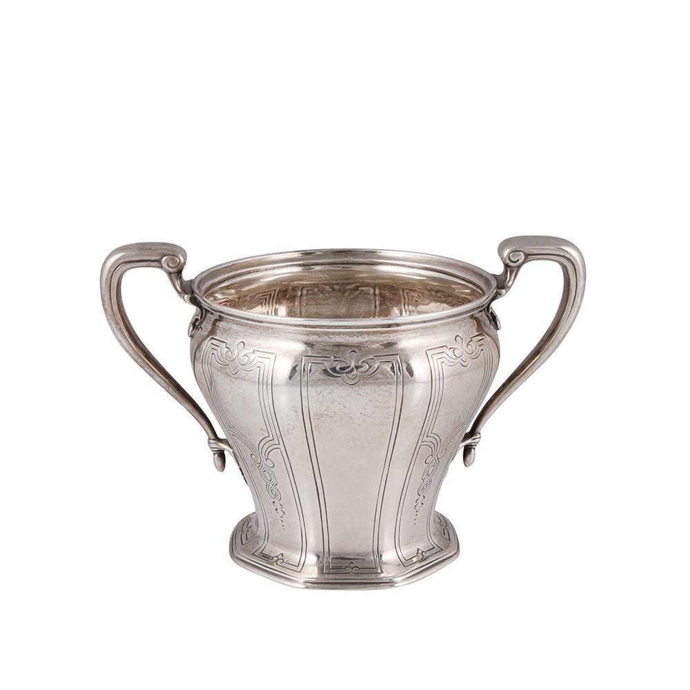 in argento 925, a corpo espanso inciso a motivi geometrici. Base ottagonale e manici laterali a nastro, gr. 290 ca. Firmata: Tiffany & Co. Numerata: 18082A Makers 5373 Data incisa sul fondo: July 16, 1918