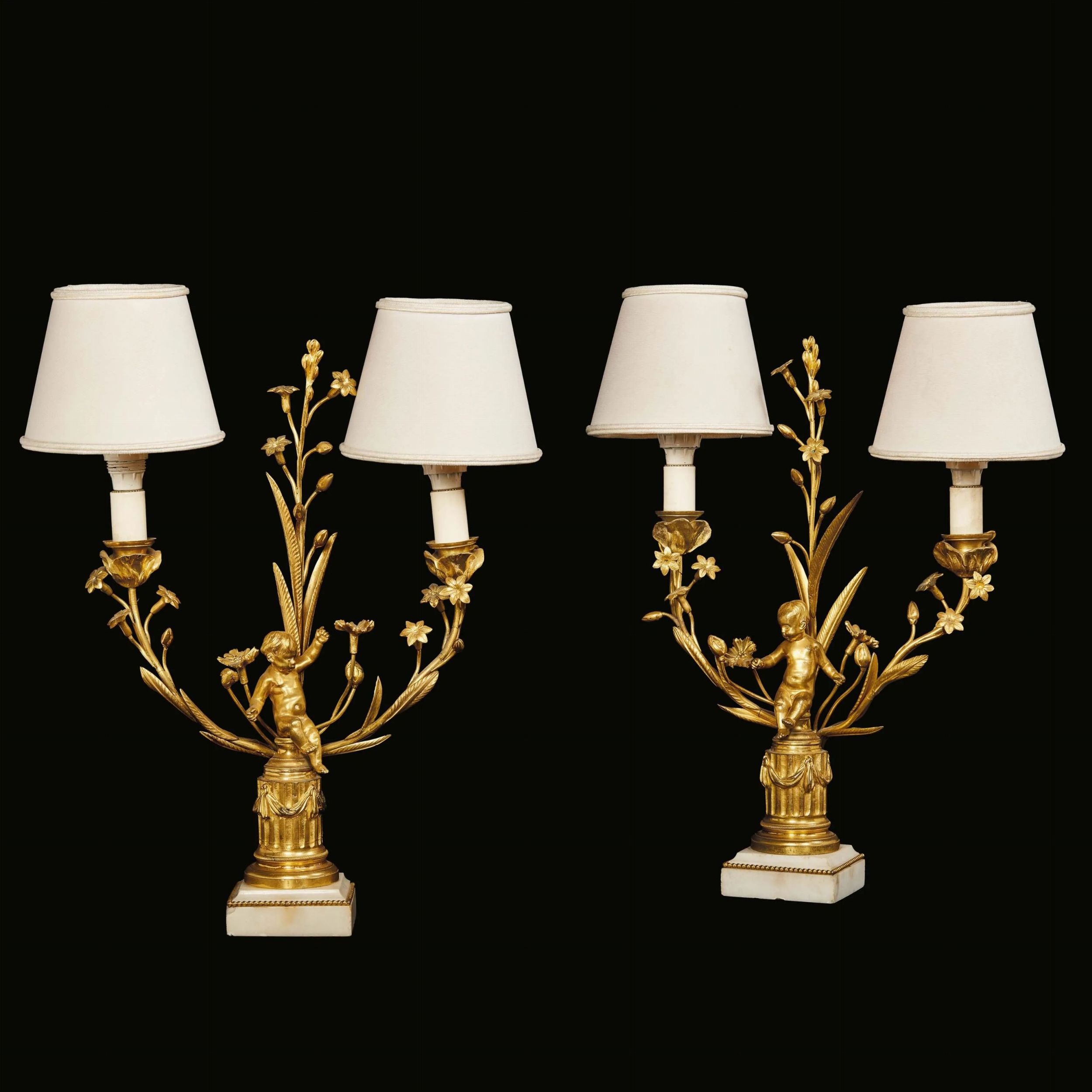 in bronzo dorato su basi in marmo bianco, al centro figure di putti, da cui partono rami di fiori e foglie, seduti su mezze colonne scanalate arricchite da festoni, cm 42x28,5x10 (montati a elettricità)