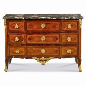 COMMODE, FRANCIA, SECOLO XVIII lastronato in legni scuri, con piano in marmo, fronte e fianchi di linea mossa; [..]