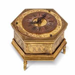 OROLOGIO DA TAVOLO ORIZZONTALE, GERMANIA, INIZIO SECOLO XVIII in ottone dorato, con cassa di forma esagonale, [..]