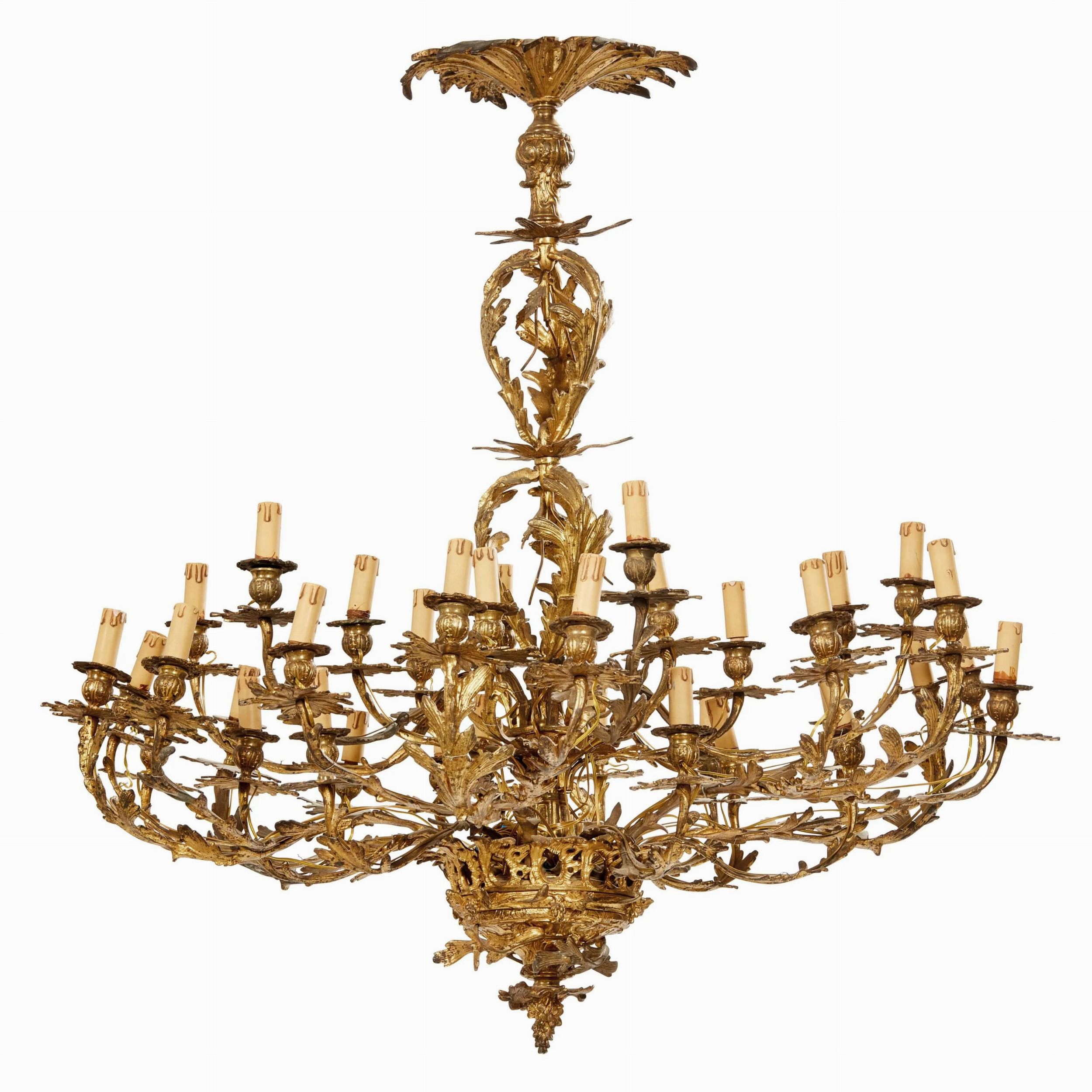 in bronzo cesellato e dorato, a trentasei luci, cima ad ampie foglie da cui pende fusto con ricco ramages intrecciato a reggere due palchi di rami terminanti in bobeches, cm 110x115x115