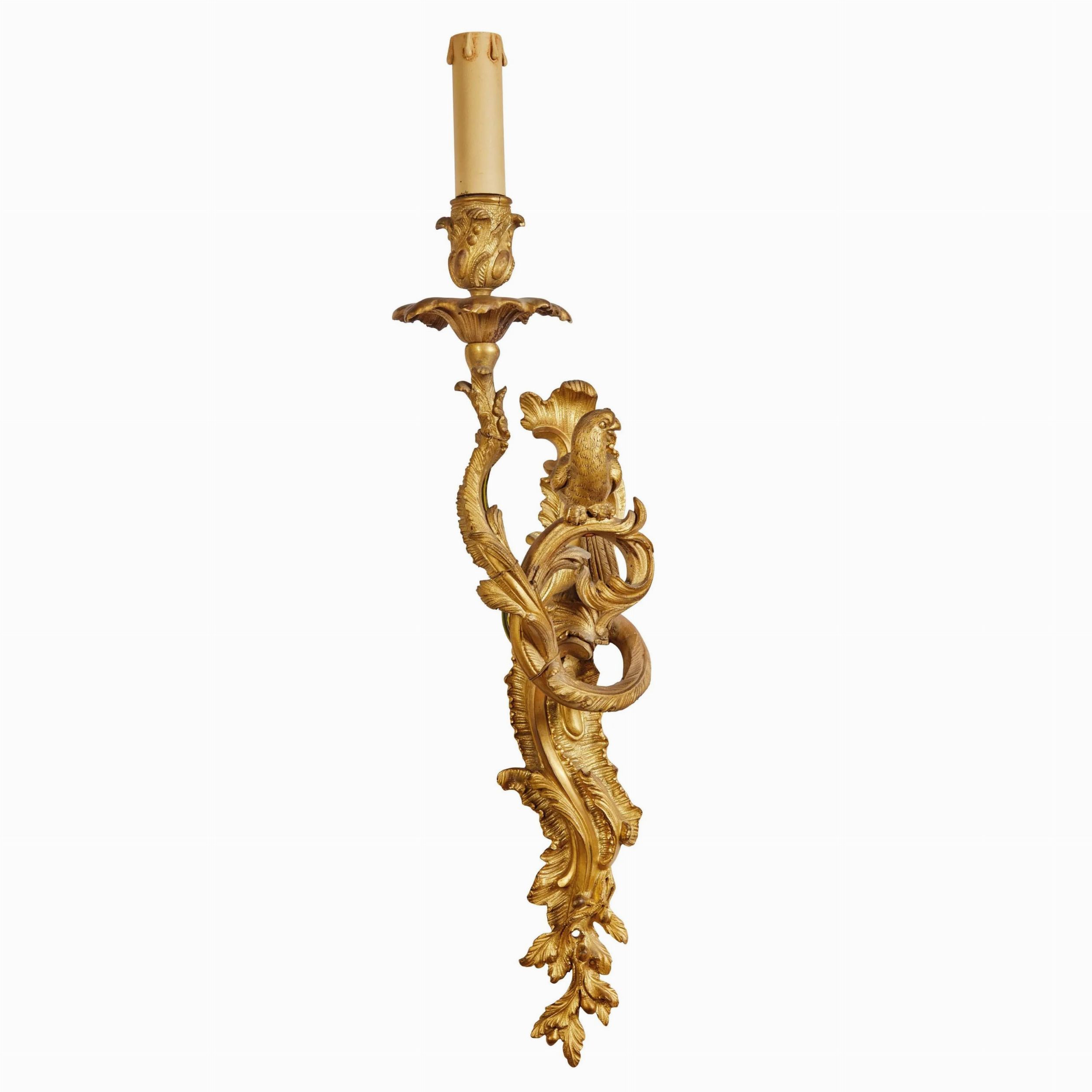 in bronzo dorato, sostegno a volute fogliacee da cui si sviluppa ramage su cui poggia un pappagallo e termina in bobeche , cm 44x12x17,5