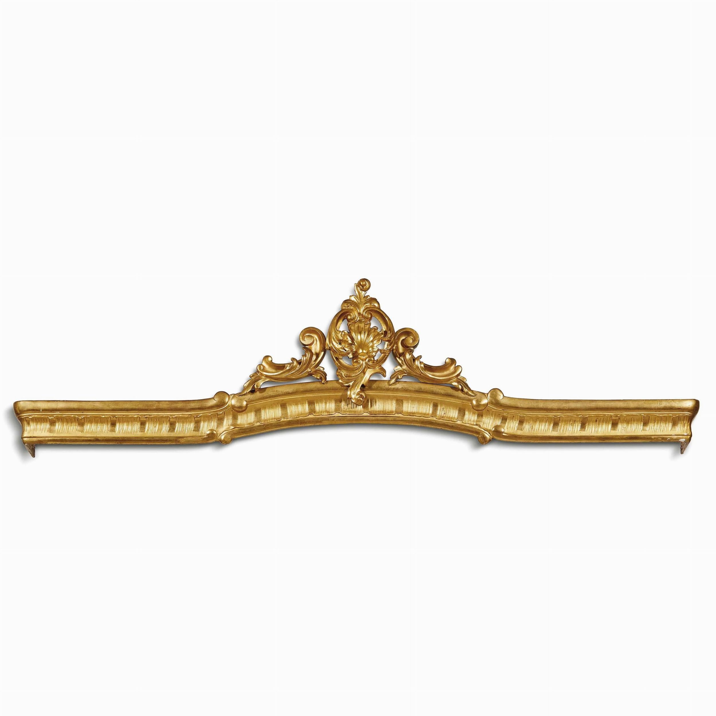 SEI MANTOVANE, ITALIA MERIDIONALE, SECOLO XIX in legno dorato e intagliato, fascia incisa a fogliette stilizzate entro cornice a lunghe volute ricorrenti, cimasa a giorno scolpita a volute a ricciolo poste a inquadrare motivo rocaille a foglia aperta; cm 38x168x24 (4), cm 38x168x38 (2)