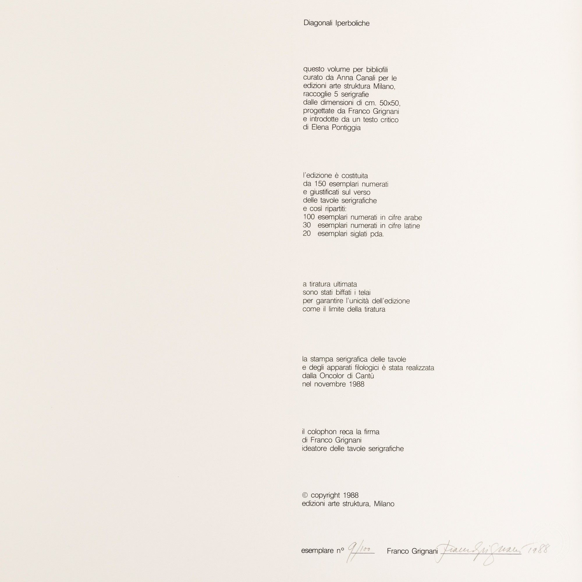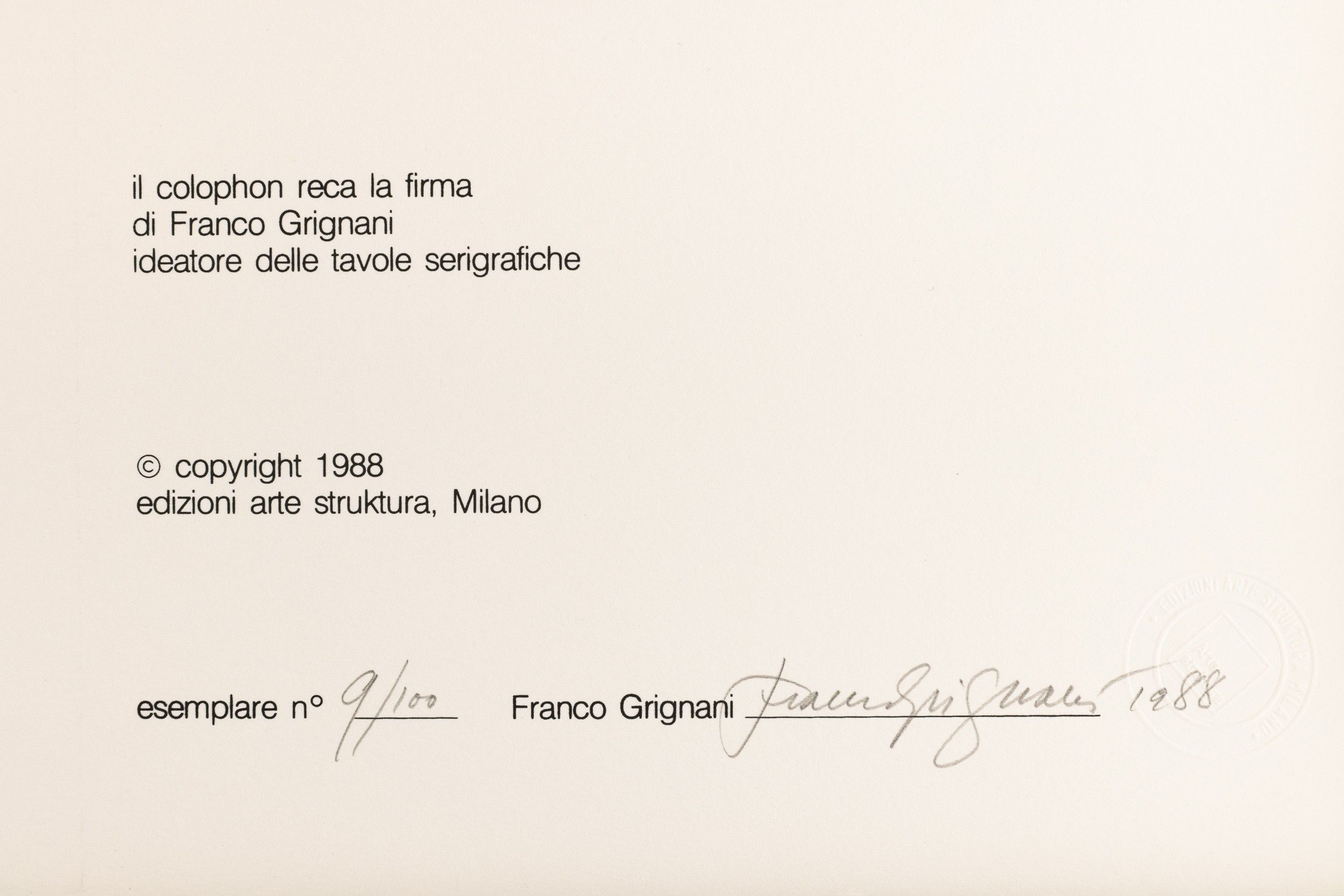 serigrafia, Largh. 50 - Alt. 50 cm 1988 ess. 9/100 su una tiratura di 100 esemplari in numeri arabi, 30 esemplari in numeri romani e 20 prove d'artista, Edizioni Arte Struktura, Milano Cartella contenente 5 serigrafie originali con testo introduttivo di E. Pontiggia Edizione firmata e numerata a matita nel colophon Ciascuna serigrafia è datata, firmata e numerata a matita al retro