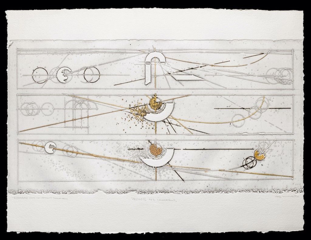 acquaforte con retouche con foglia d'oro, Largh. 98,5 - Alt. 74 Cm 1993 es. unico firmato e datato in basso a destra, intitolato in basso al centro e numerato in basso a sinistra tiratura 50 + XV + 2 p.a + 1 esemplare unico carta Colombe stampatore Sardella, Milano ed Colophon, Belluno