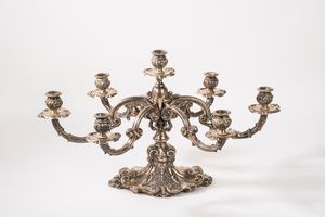 in argento, Peso kg 2,946 cm 36,00x61,00 Italia, 1935/1945 sbalzato con decori fogliacei, bracci a volute, reca [..]