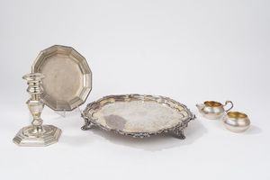 in argento, Peso lordo kg 1,391 Italia e Inghilterra, secolo XIX/XX composto da un salver, città di Sheffield [..]