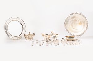 in argento, Peso kg 2,362 Italia, secolo XX composto da un piatto, un centrotavola, una zuccheriera, una salsiera, [..]