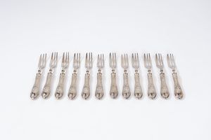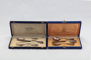 in argento, Peso g 400,00 Italia, secolo XX due servizi da 12 e uno da 10, per totale di 34 pezzi, con astucci [..]