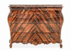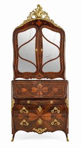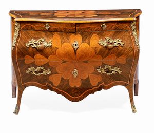 cm 120X56X263 Mosso sul fronte e sui fianchi, lastronatura di fondo in violetto con intarsi con motivi di quadrifogli [..]