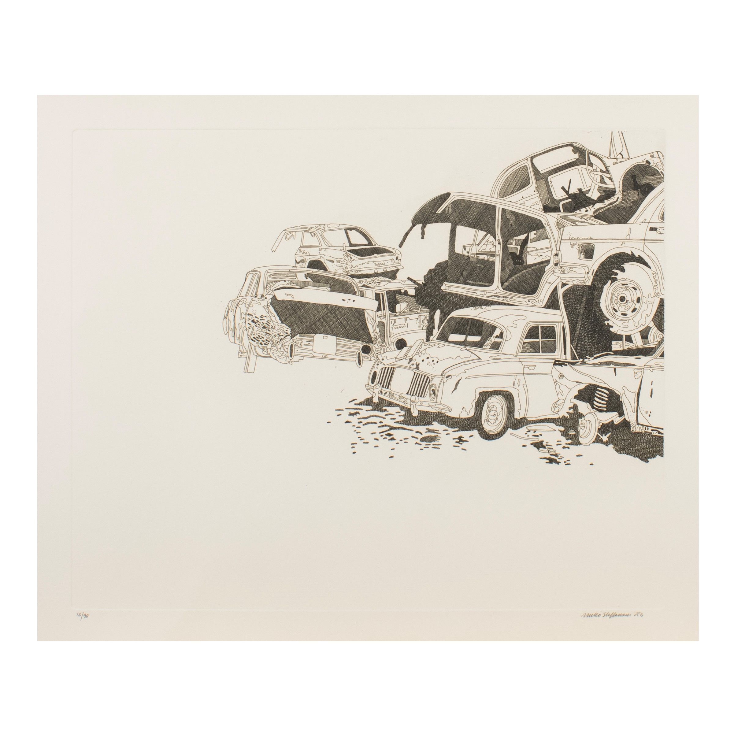 Bergamo 1938 'Cimitero di macchine', 1972, acquaforte, es. 12/90, firmata e datata a matita in basso a destra, timbro a secco Il Torcoliere in basso a destra
