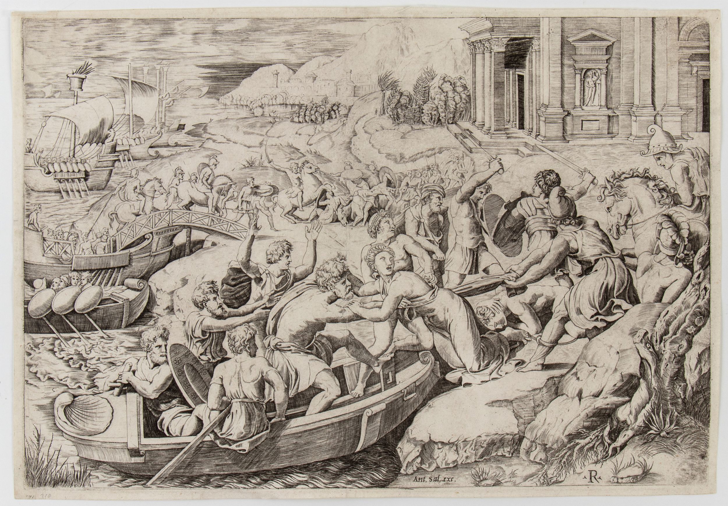Bulino, 310 x 443 mm. II stato su 3, con l'indirizzo di Antonio Salamanca. Bartsch XIV.171.210. Stampata su carta vergata sottile con filigrana (ancora nel cerchio). Esemplare con piccoli margini. Alcuni restauri sulla traccia della piega verticale e lungo i bordi molto ben eseguiti. Al verso, marchio da collezione non identificato.